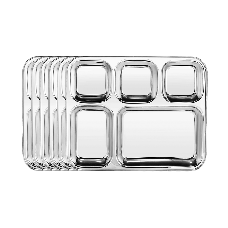 Experience the perfect blend of style and functionality with the RIAR Stainless Steel Dinner thali Designed with a modern square shape, this silver plate is an excellent choice for serving lunch, dinner, or thali-style meals. Measuring 31  cm in diameter and 1.5 cm in height, it provides ample space for versatile servings. Made from premium stainless steel, the plate is lightweight at 430 g, stain-resistant, and durable enough for daily use or special occasions. It is dishwasher-safe for convenience, though hand washing is recommended to maintain its polished finish. Ideal for hot or cold meals, this plate adds a touch of sophistication to any table setting.Riar Stainless Steel 5in1 Square Compartment Lunch and Dinner Heavy Duty Stainless Plates (Set of 6)/Divided Everday Serving tray/5-section Divided Mess Plates for Kids/Bhojan thali